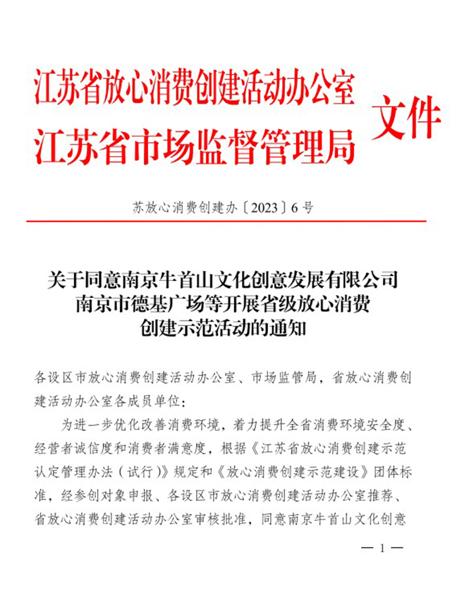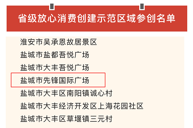 日前,江蘇省放心消費創建活動辦公室、江蘇省市場監管局發布了2023年度江蘇省級放心消費創建示范單位、示范區域參創名單,集團先鋒國際廣場成功入選了省級放心消費創建示范區域參創名單。