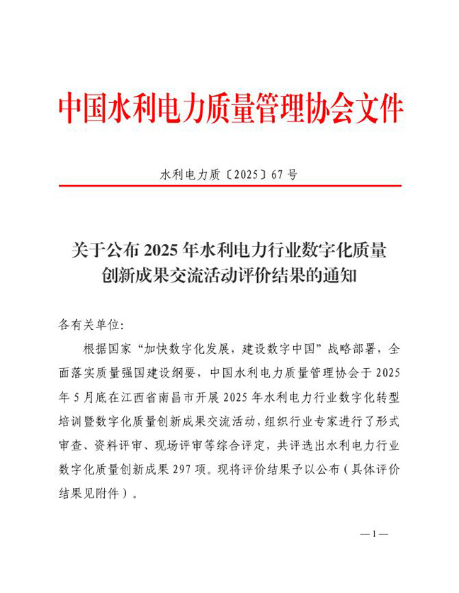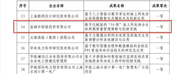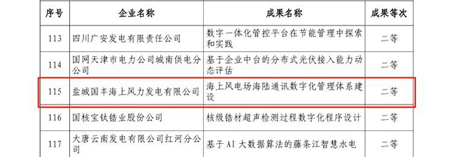 近日,中國水利電力質量管理協會發布《關于公布2025年水利電力行業數字化質量創新成果交流活動評價結果的通知》,集團能源板塊國能公司《數字化賦能的“5A級”海上風電場全生命周期質量管理策略與創新實踐》、國豐公司《海上風電場海陸通訊數字化管理體系建設》兩項創新成果脫穎而出,分別榮獲一等獎與二等獎。