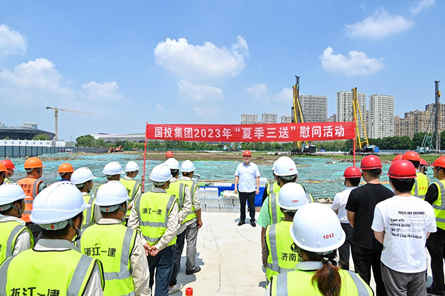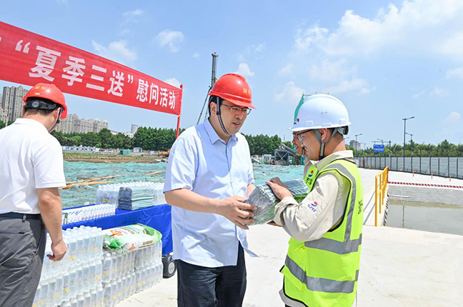 在大數(shù)據(jù)交通指揮中心項(xiàng)目現(xiàn)場,張林海與奮戰(zhàn)在高溫一線的施工人員親切交談,關(guān)切詢問防暑降溫、日常工作等情況,對他們不畏高溫、堅(jiān)守崗位的精神給予充分肯定,并將防暑物資一一送到他們手中,叮囑大家在工作中要做好自我防護(hù)、注意勞逸結(jié)合、保證自身安全。